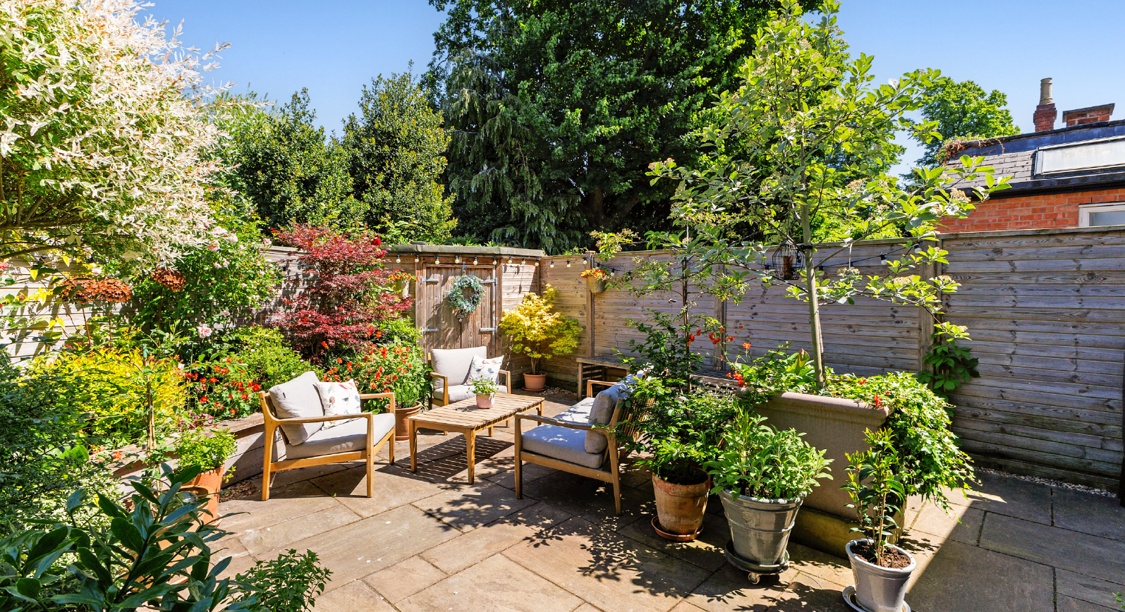 Step outside into the charming garden, where a paved terrace beckons for al fresco dining.