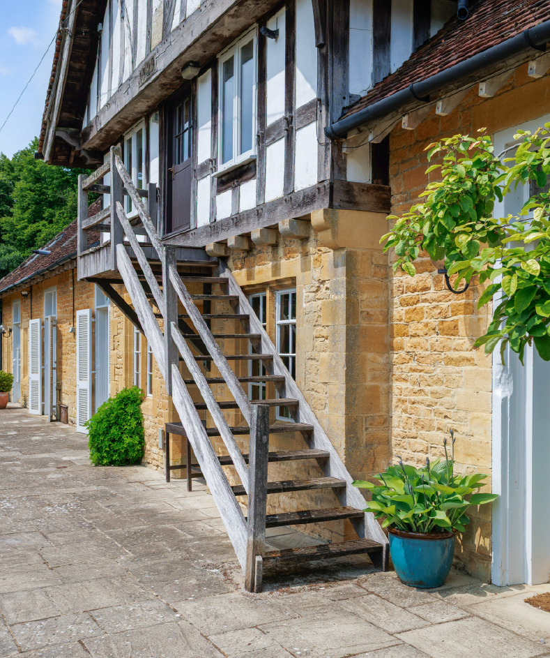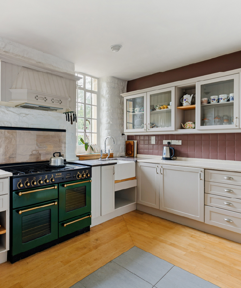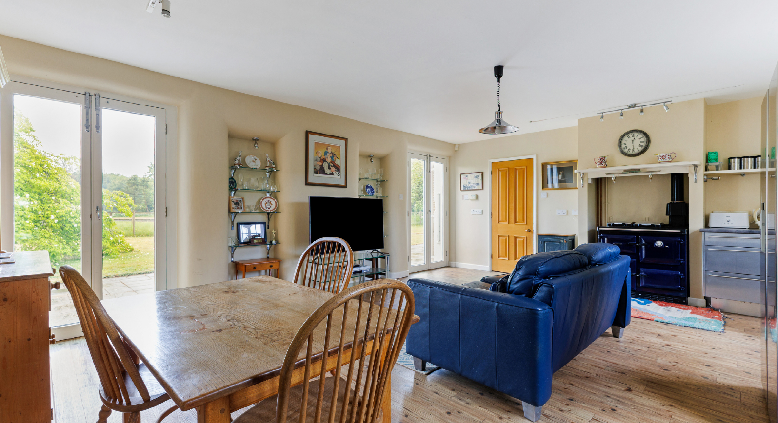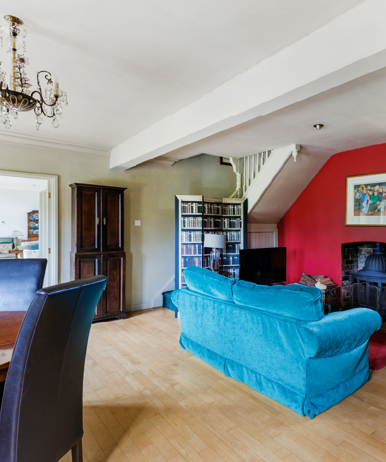 The property is full of charm and offers a flexible layout, ideal for family living, country pursuits and entertaining. On the ground floor, the spacious hallway leads to a large dining room with a log burner and stone mullion windows, creating a warm and welcoming space. The formal drawing room, with its stone fireplace and double doors opening onto the front lawns, offers a grander setting and connects seamlessly with another inviting, more intimate, room with its own fireplace and access to the garden. The property benefits from two kitchens: one with a gas range cooker and exposed brickwork overlooking the rear terraced garden, and the second with an oil-fired AGA and access to a walk-in pantry.